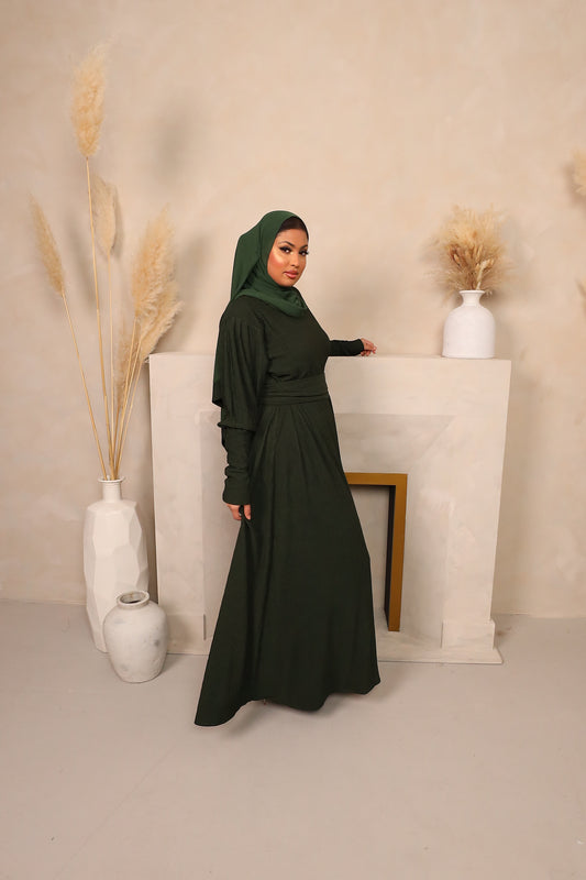 Ava Puff Sleeve textured Knit Abaya Dress in Forest Green