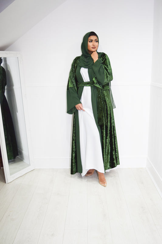 Roya Chiffon Velvet Open Flare Abaya Jacket in Dark Green