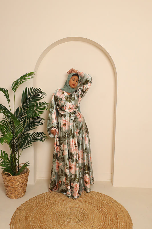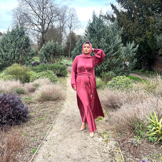 Maariah Asymmetric Satin Abaya in Rose Blush with diamante tassel embellishments