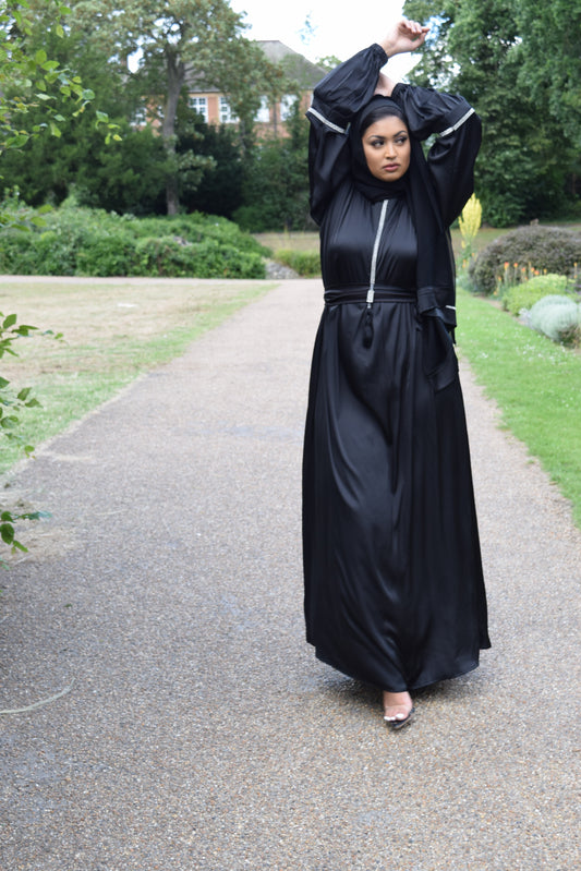 Shirin Satin Abaya with diamante and tassel embellishments Black