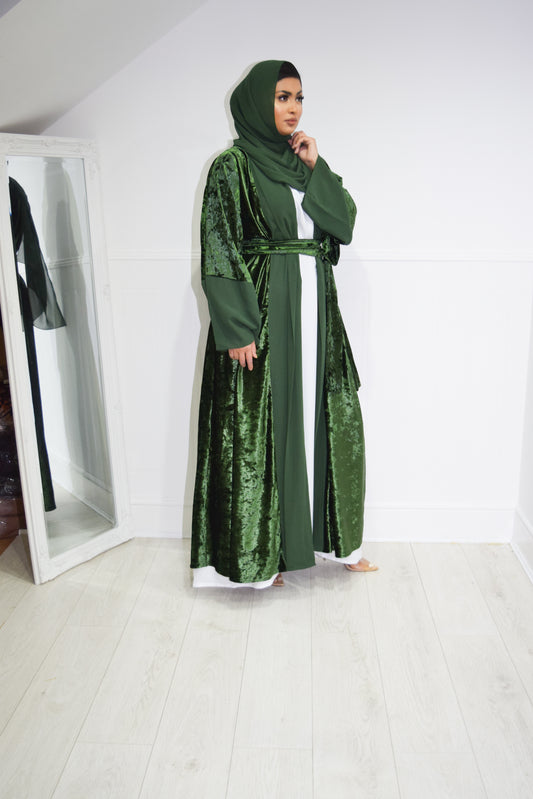 Roya Chiffon Velvet Open Flare Abaya Jacket in Dark Green