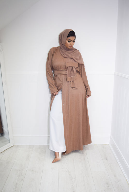 Zaiba textured Open A-line Abaya Jacket with pockets in Camel Tan