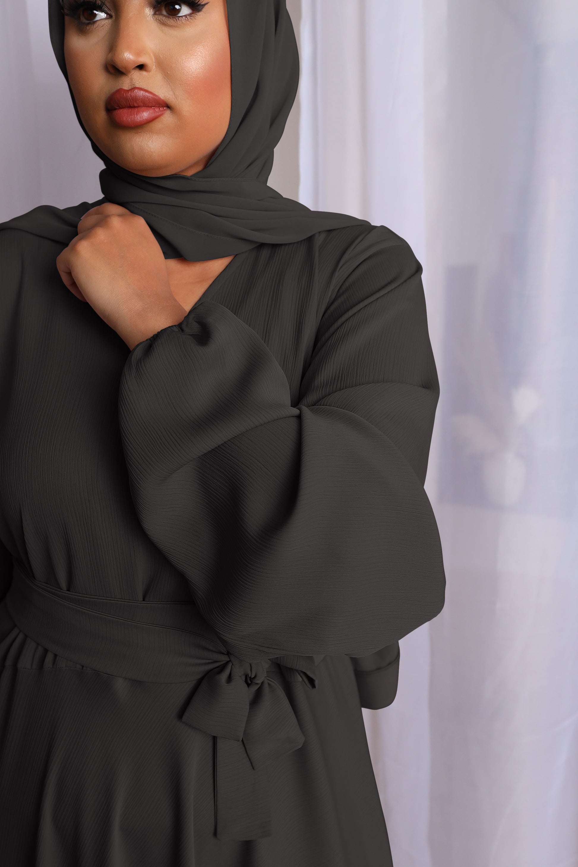 This abaya is further beautiful in its flattering cut and design with an extra long and wide belt for a stylish finish. The sleeves are an elasticated balloon design for that extra touch of comfort and style.