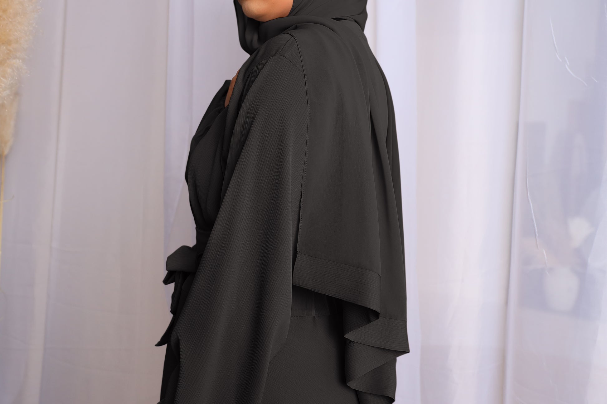 In our popular Amal design, this stunning piece is a wide flare abaya with a upper body wrap over created in a fine crinkle Black shade. The material is super soft with a luscious feel, this piece is an absolute luxury to wear.