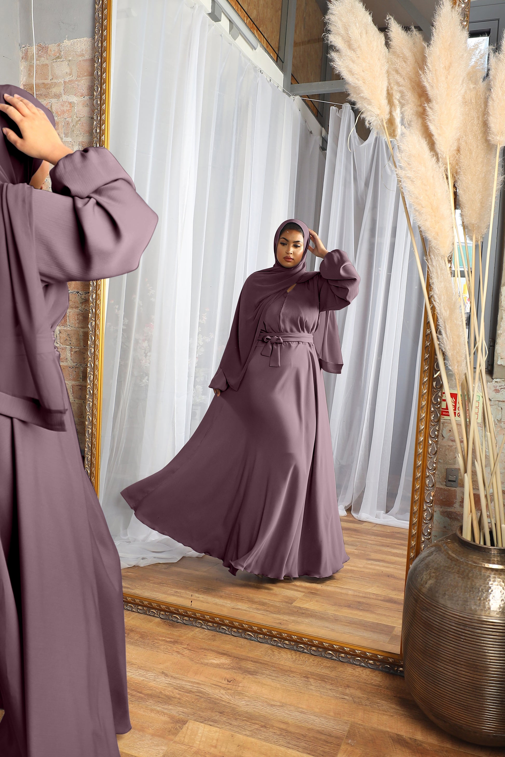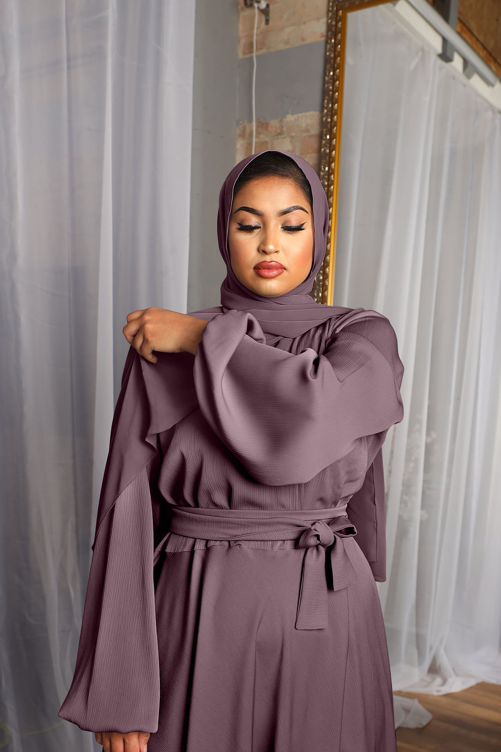 In our popular Amal design, this stunning piece is a wide flare abaya with a upper body wrap over created in a fine crinkle Heather shade. The material is super soft with a luscious feel, this piece is an absolute luxury to wear.