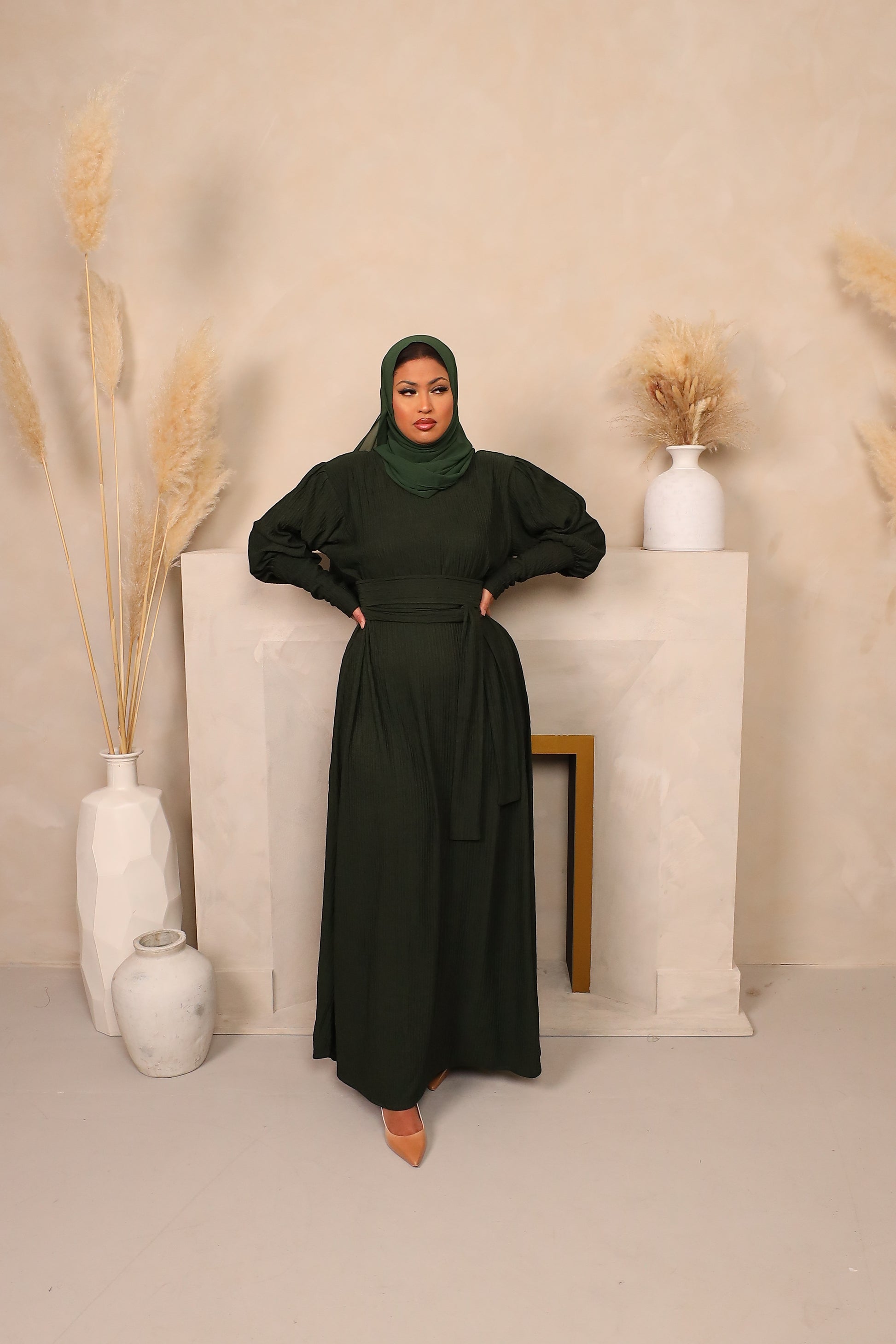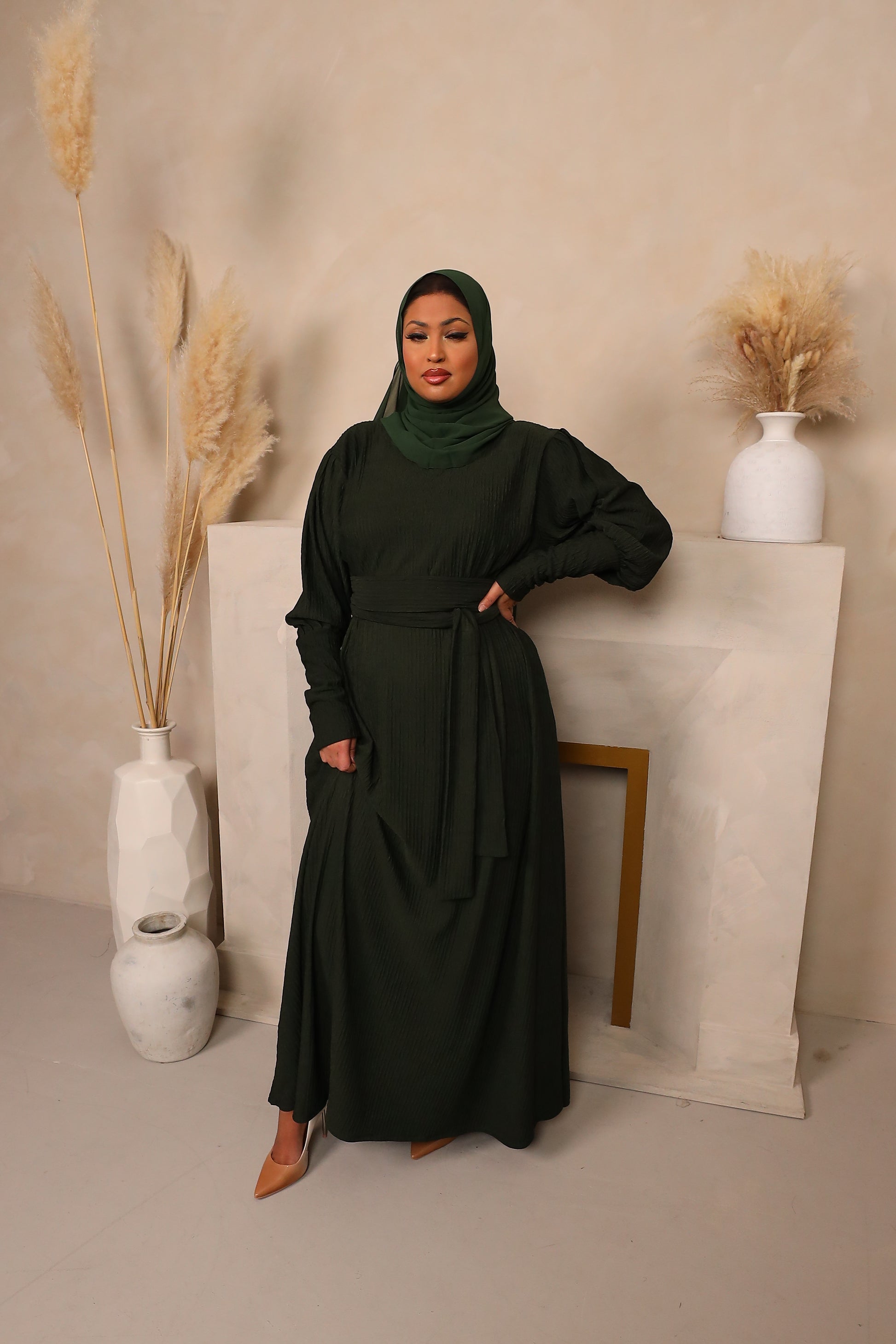 Ava Puff Sleeve textured Knit Abaya Dress in Forest Green