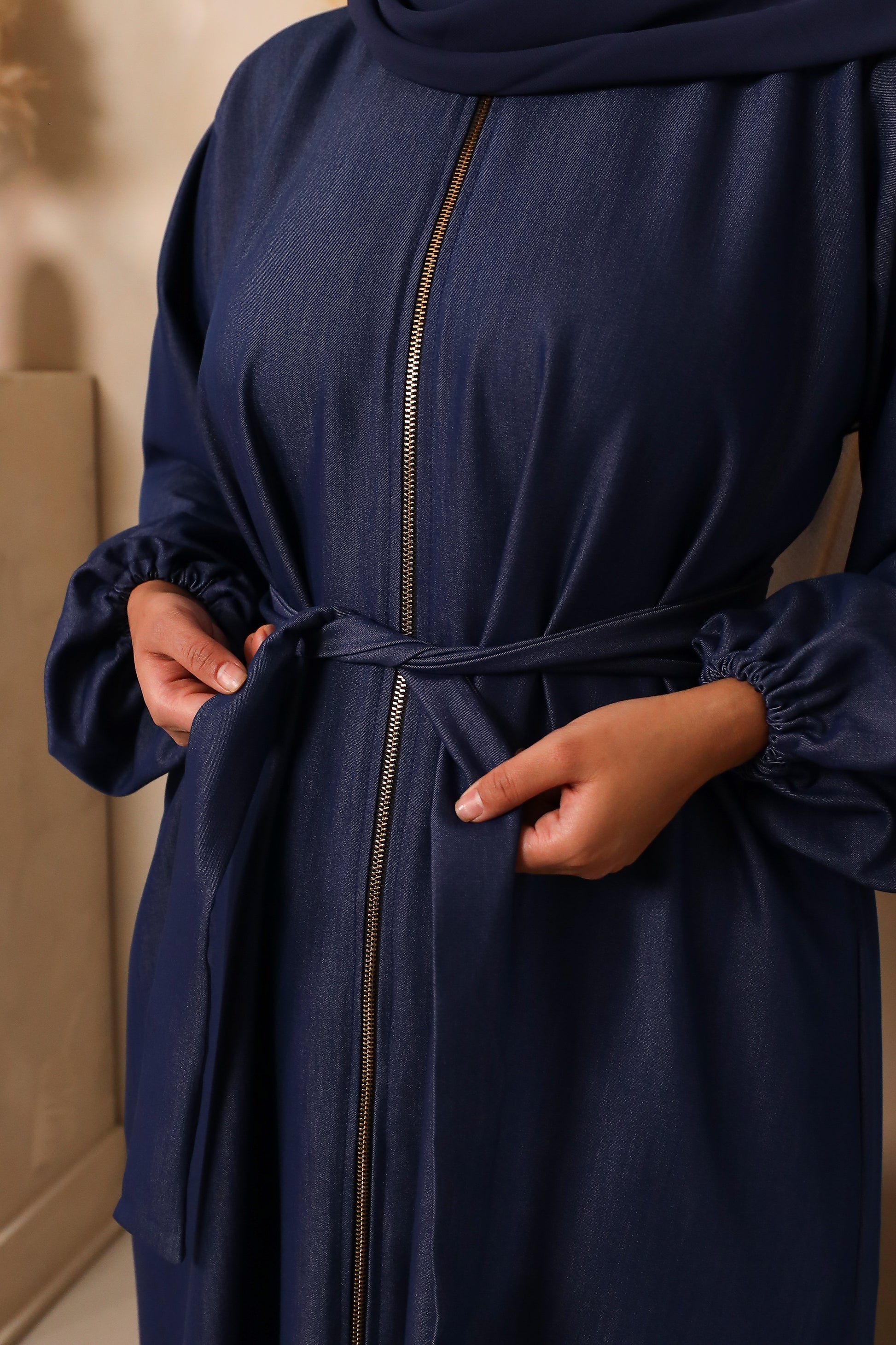 As a new addition to the Roohaya collection, meet the modestly trendy denim abaya with a full length zip design, wide flare skirt, grandad collars and elasticated subtle balloon sleeves. Created in a super soft Denim cotton fabric in Dark Blue. The material is super soft and with weight, allowing the abaya to drop beautifully. The fabric is ideal for all seasons and is timeless