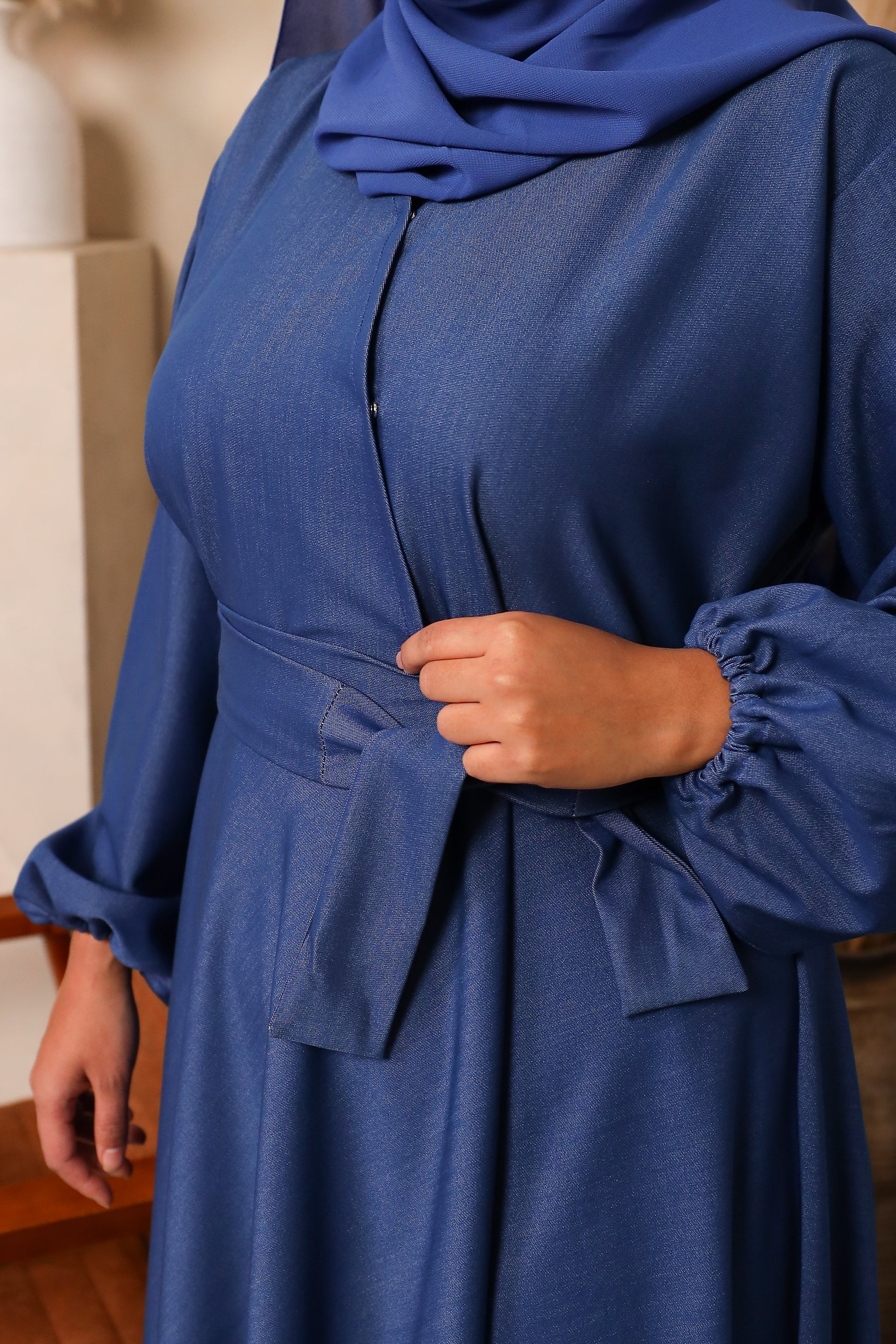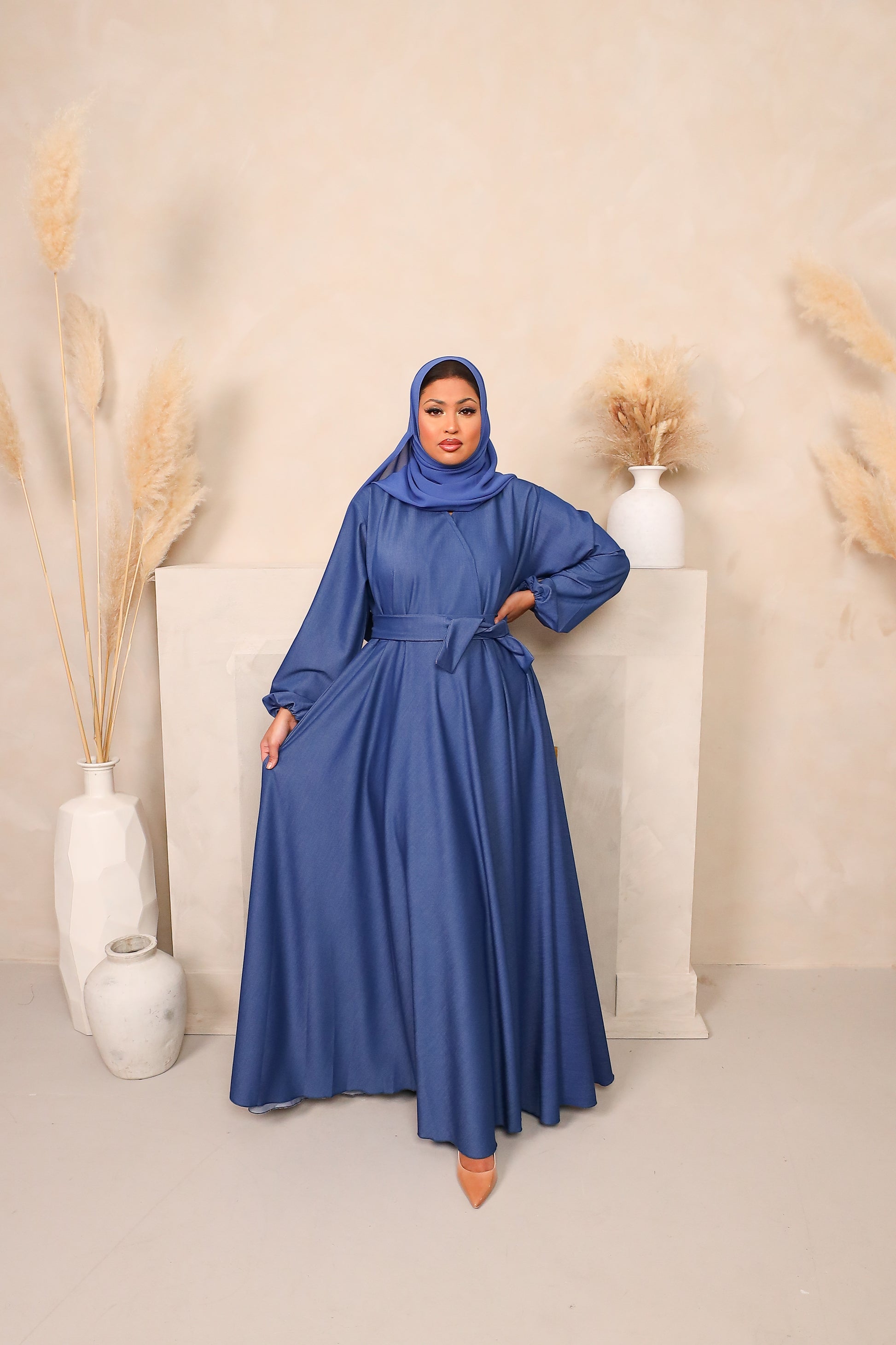 In our popular Amal design, this is a stunning piece, a wide flare abaya with a upper body wrap over created in a soft subtle stretch of cotton denim. The material is super soft with a luscious feel, this piece is an absolute luxury to wear.