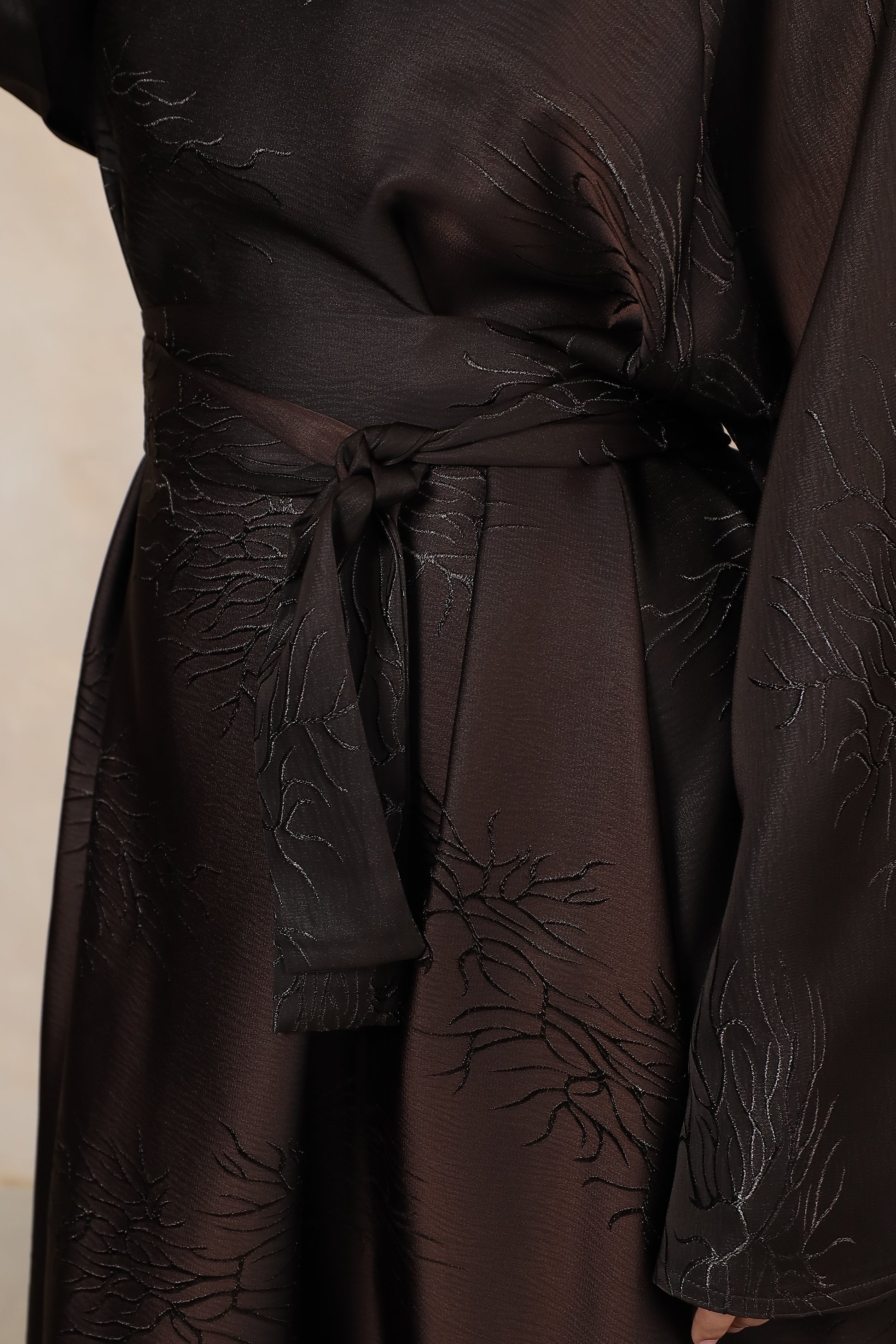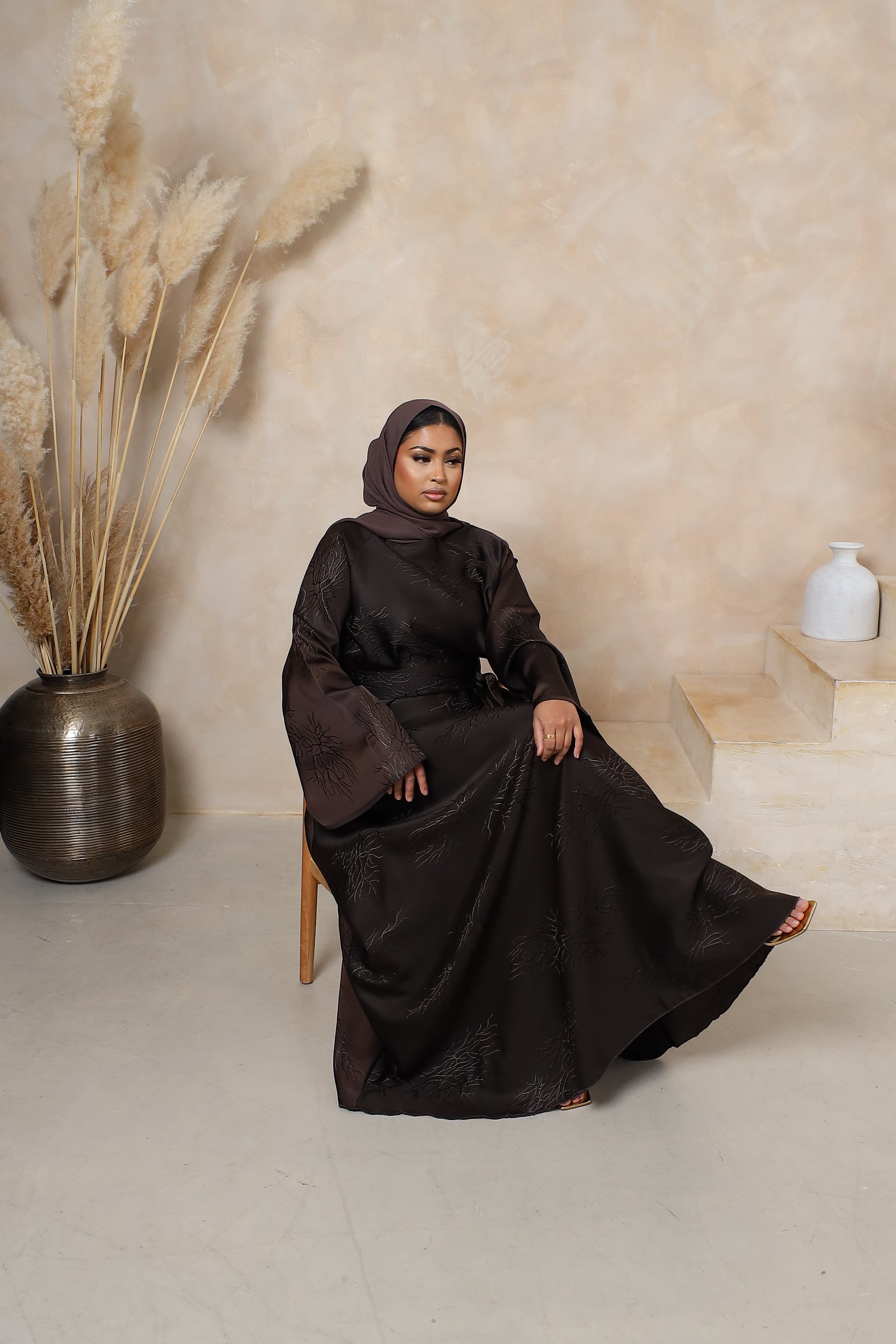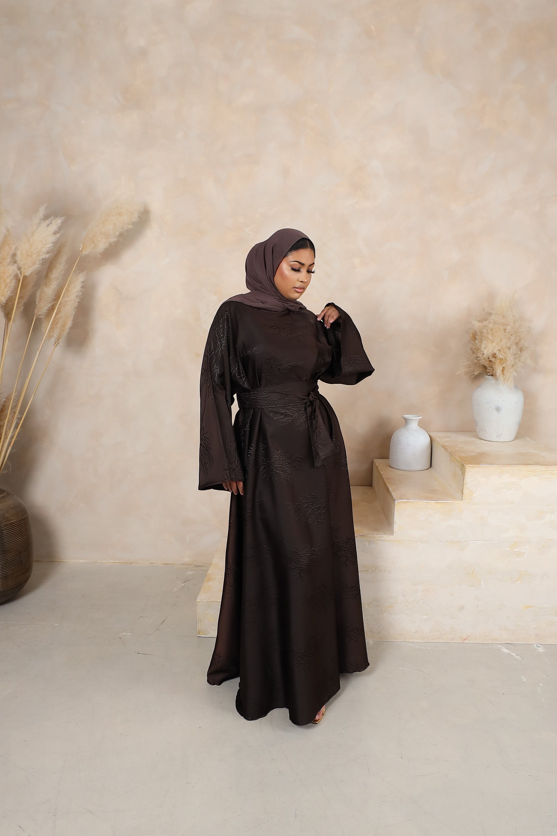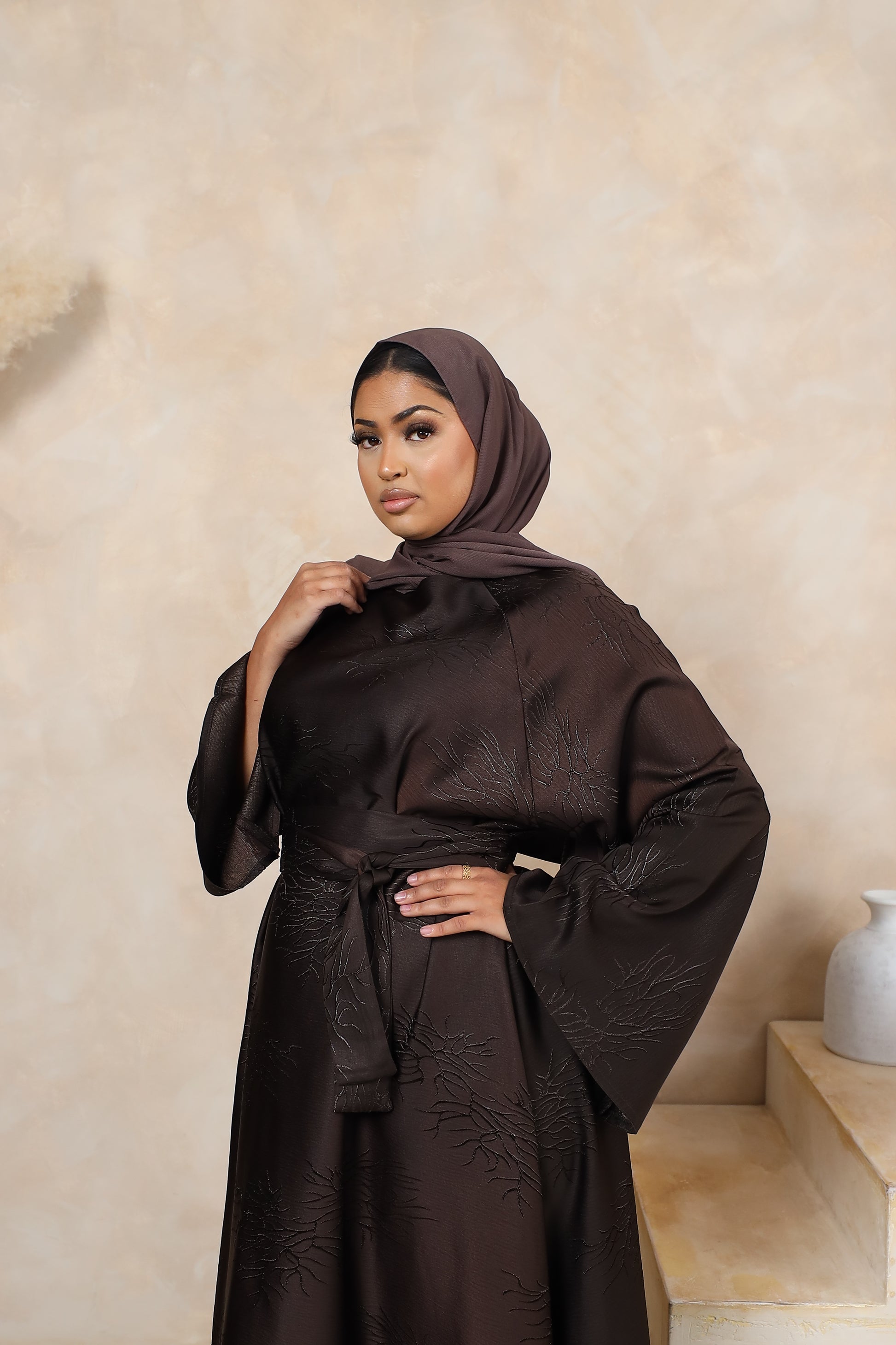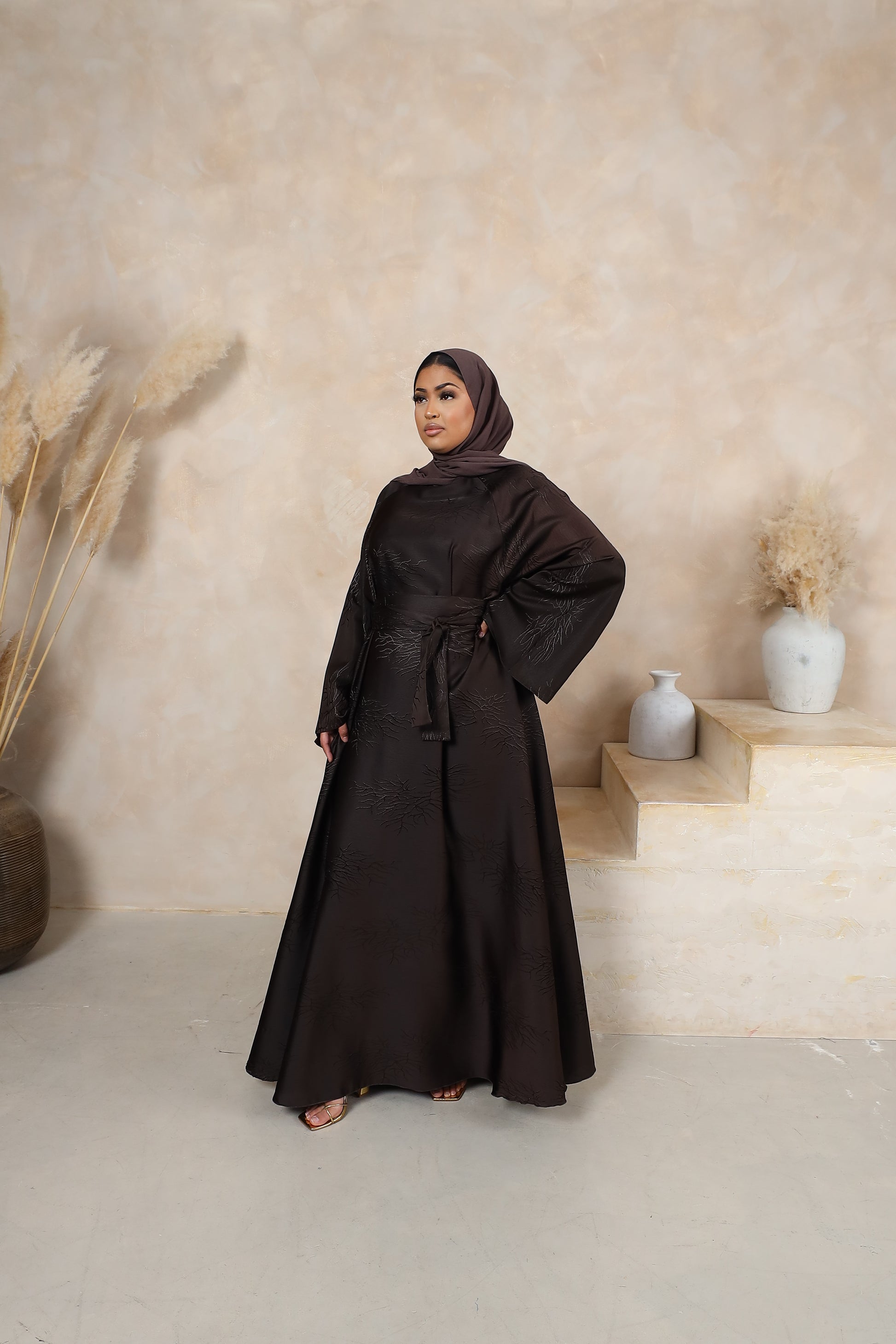 This stunning piece is a wide flare abaya with kimono sleeves. The material is super soft and a luxurious jacquard edition, this piece is an absolute luxury to wear.