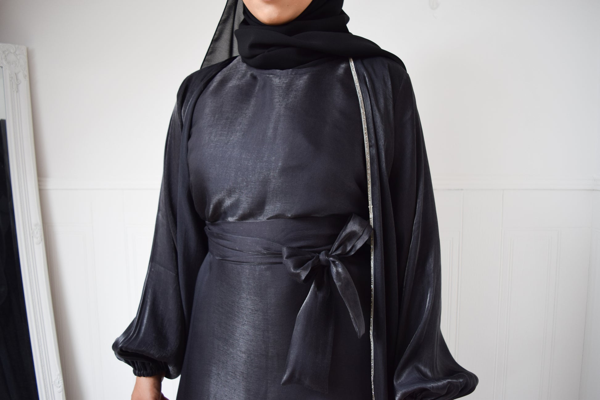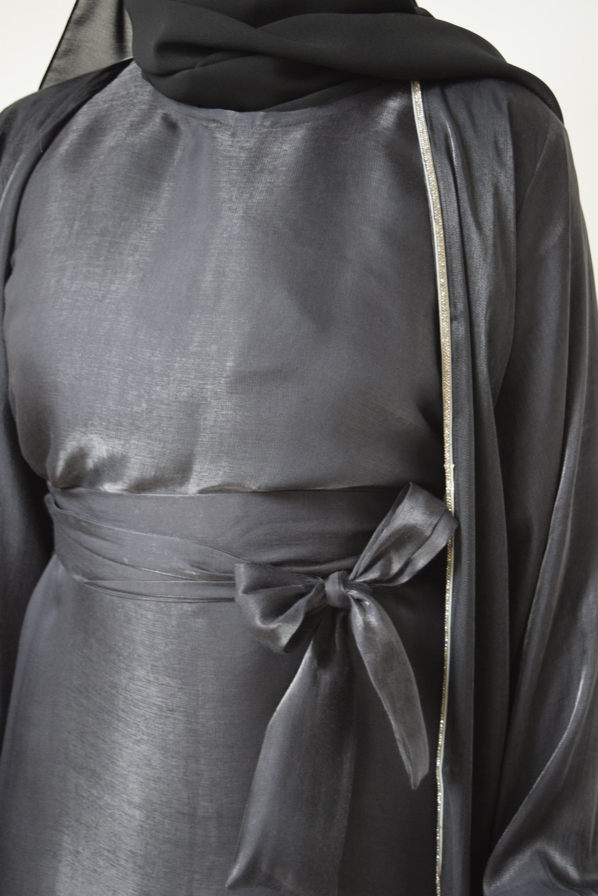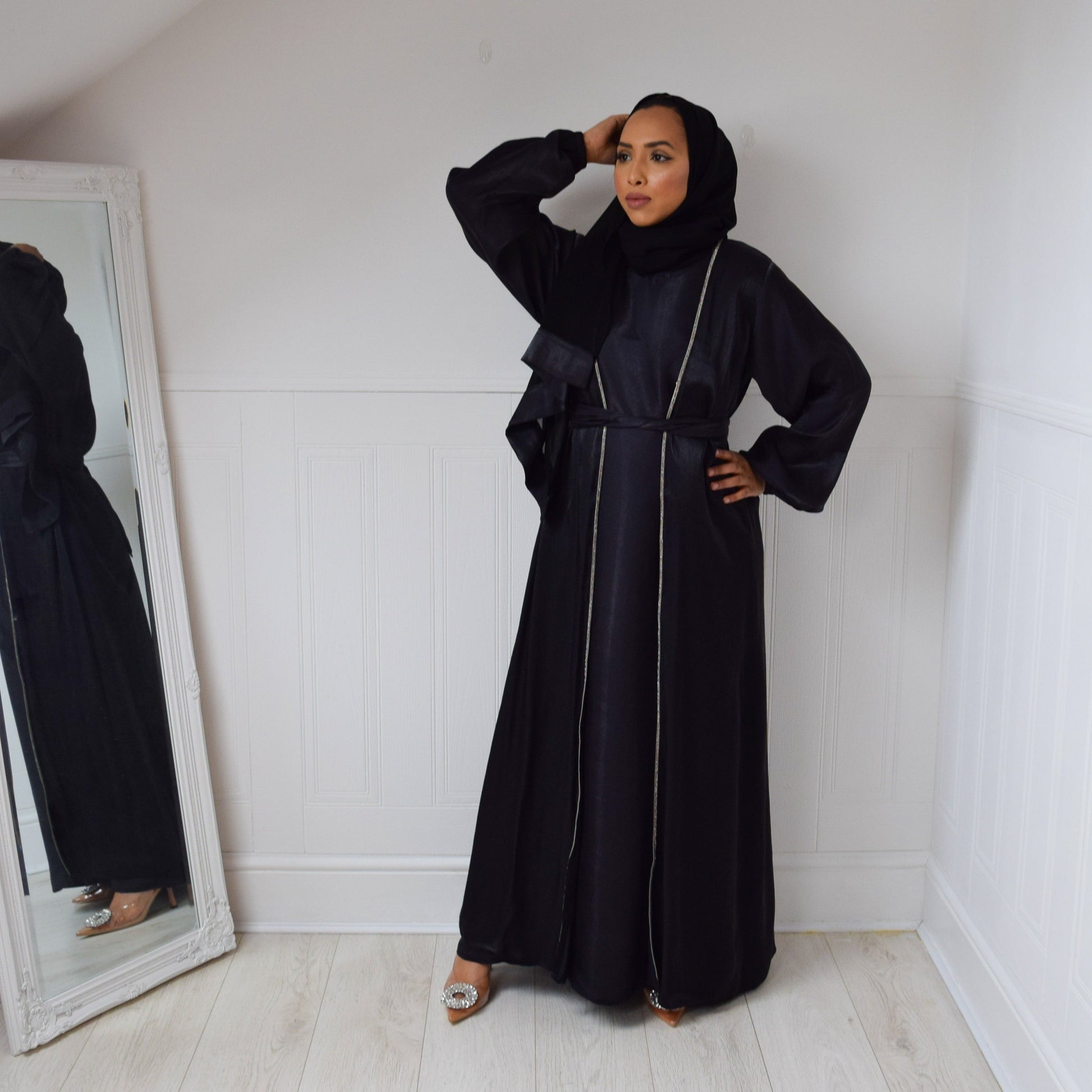 This abaya set consists of a matching twin set of an open puff sleeved abaya with a delicate slim silver trim and an inner sleeveless slip. A formal piece that simple yet elegant.