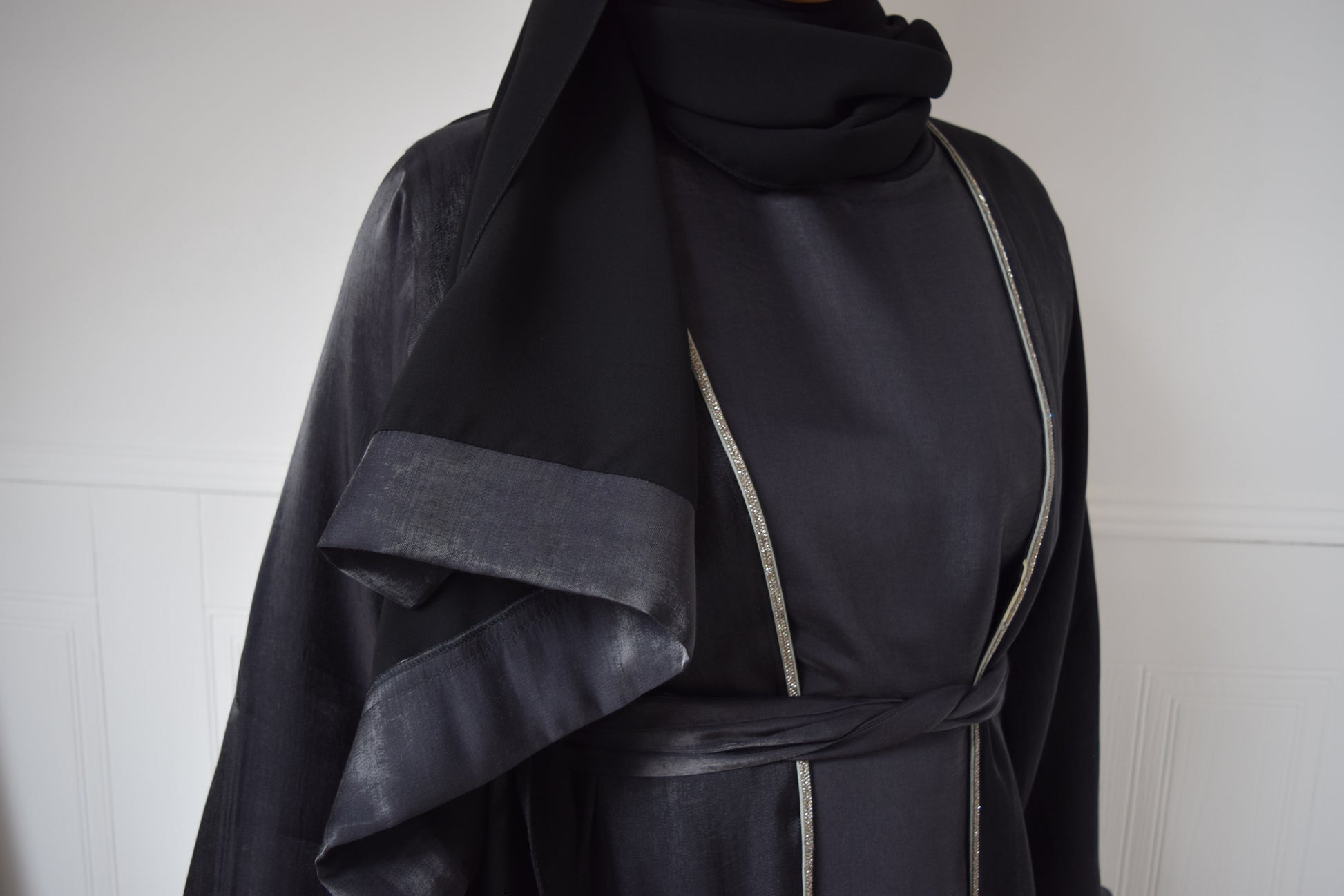 Malak Twin abaya set in shimmer Black and Silver trim
