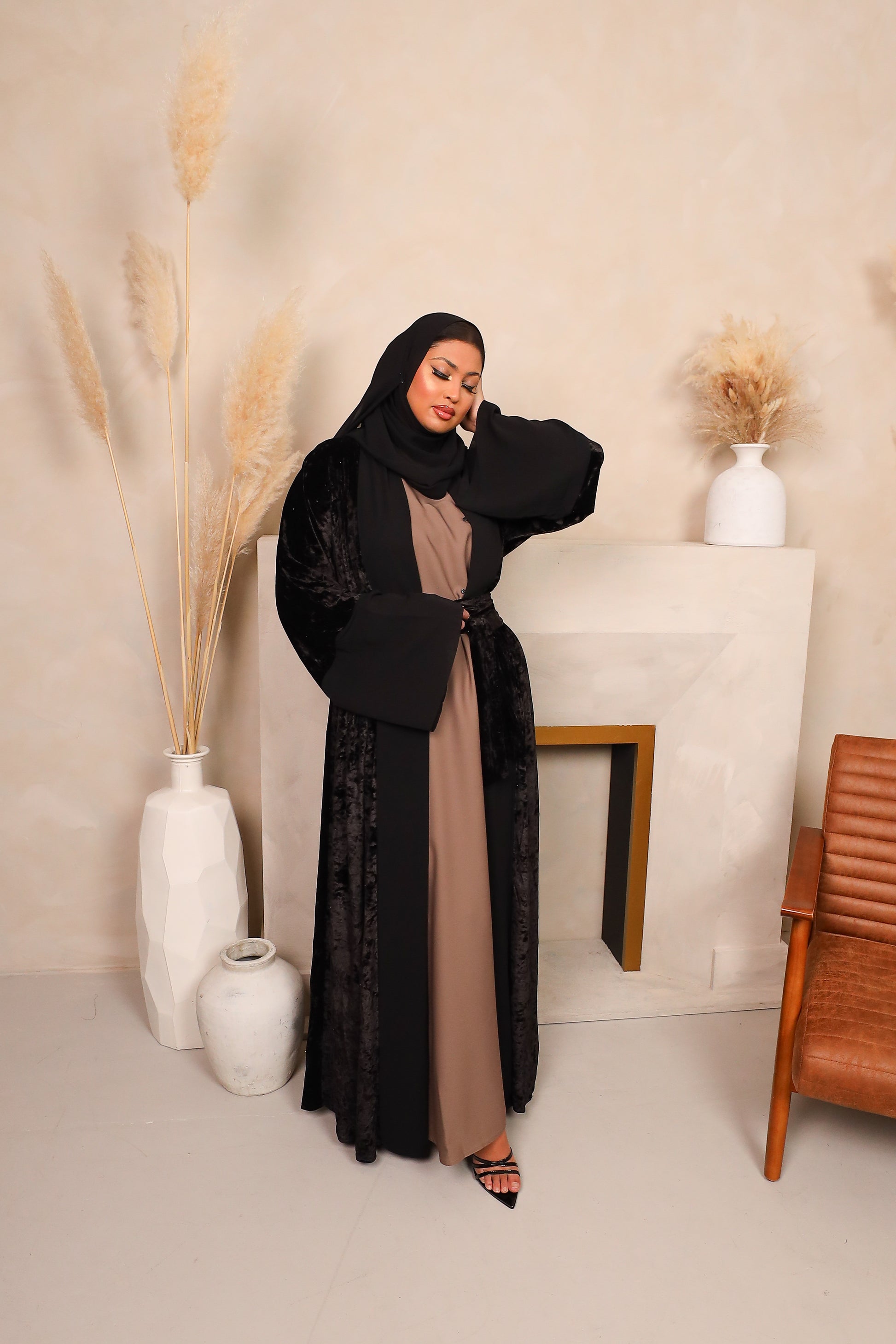 Model is wearing with the Taupe inner abaya, Sold separately
