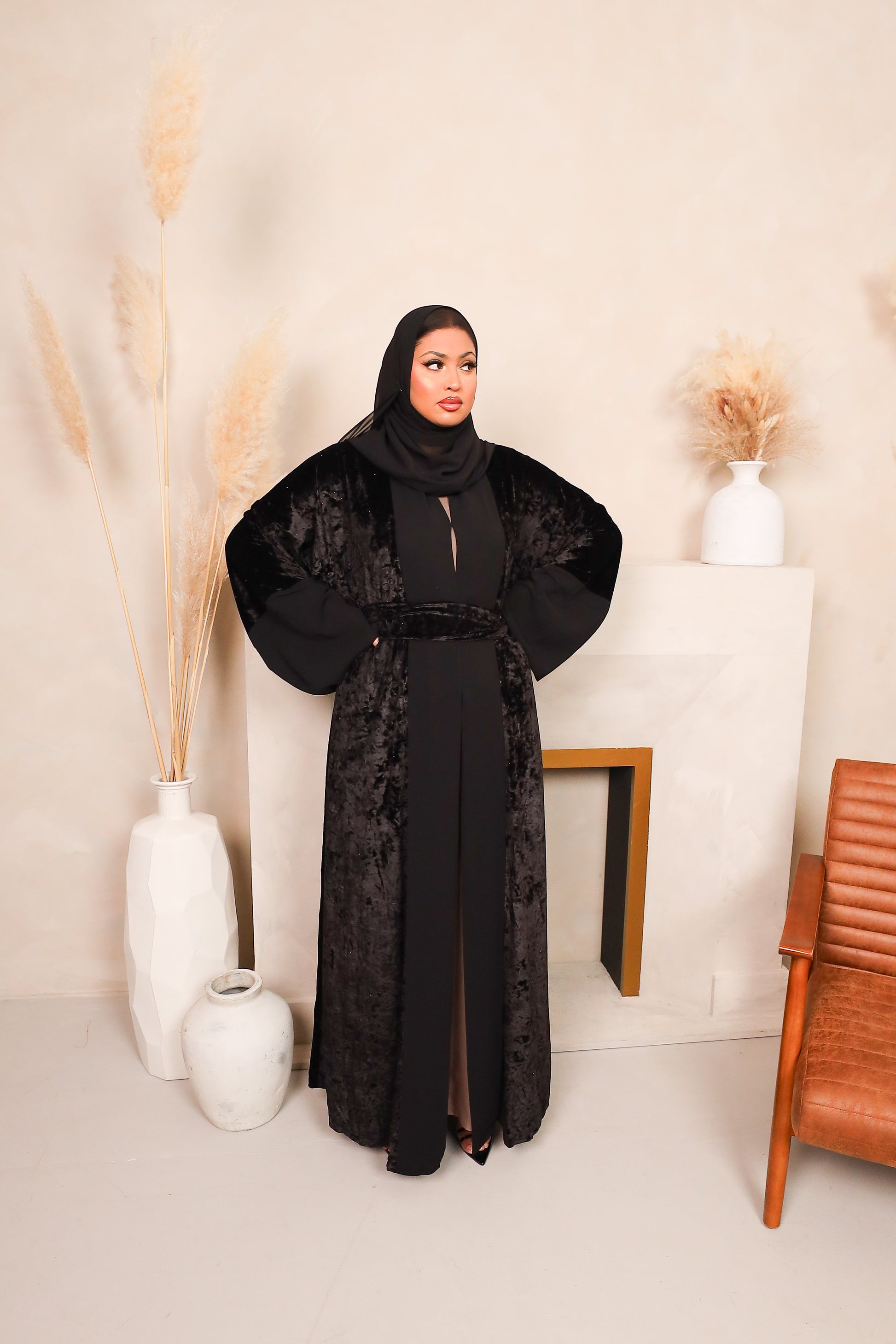 In a flare cut, this abaya is a perfect shape and is flattering to all shapes and sizes. Made from a soft velvet and a wide chiffon panel on the opening, this includes wide kimono sleeves with a wide chiffon cuff.
