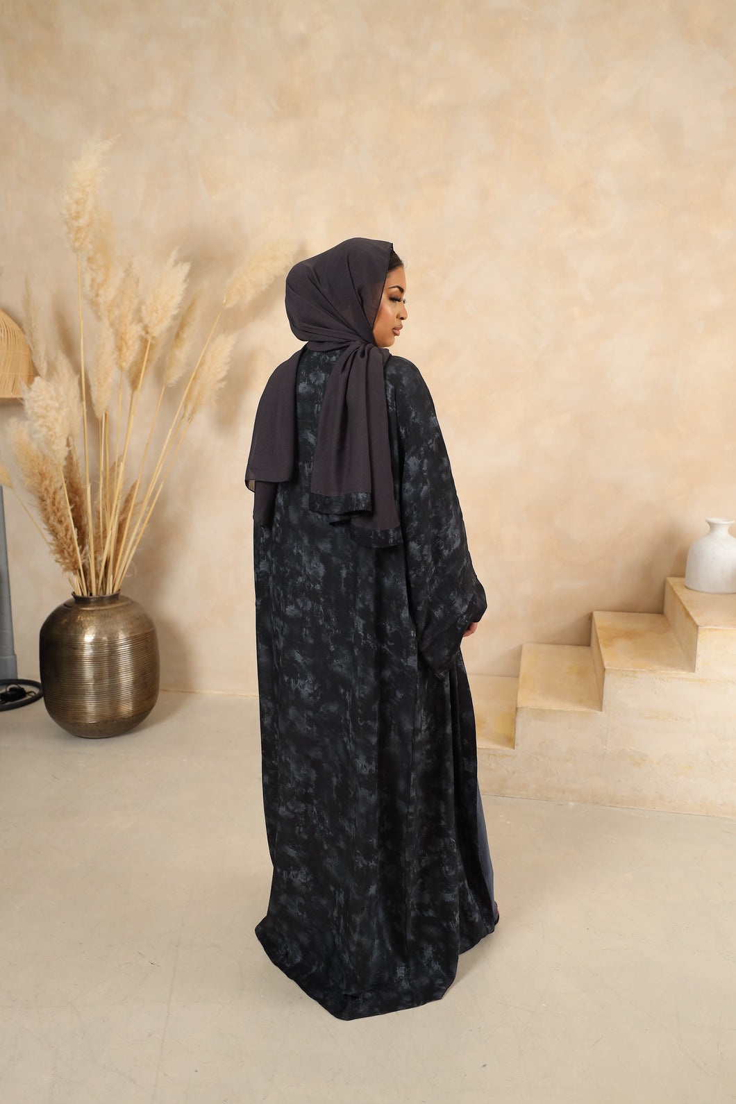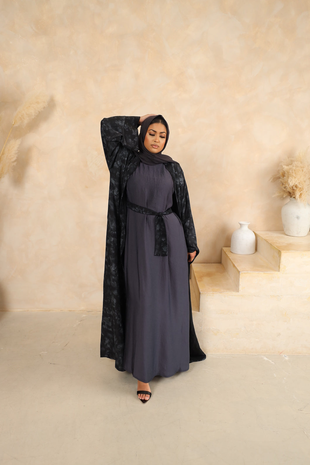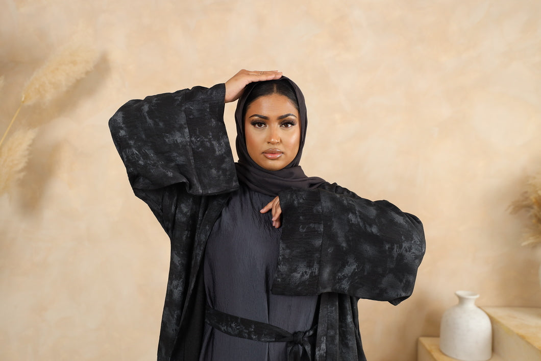 Tie dye A-line Open Jacket Abaya in Midnight Black - 4 piece set