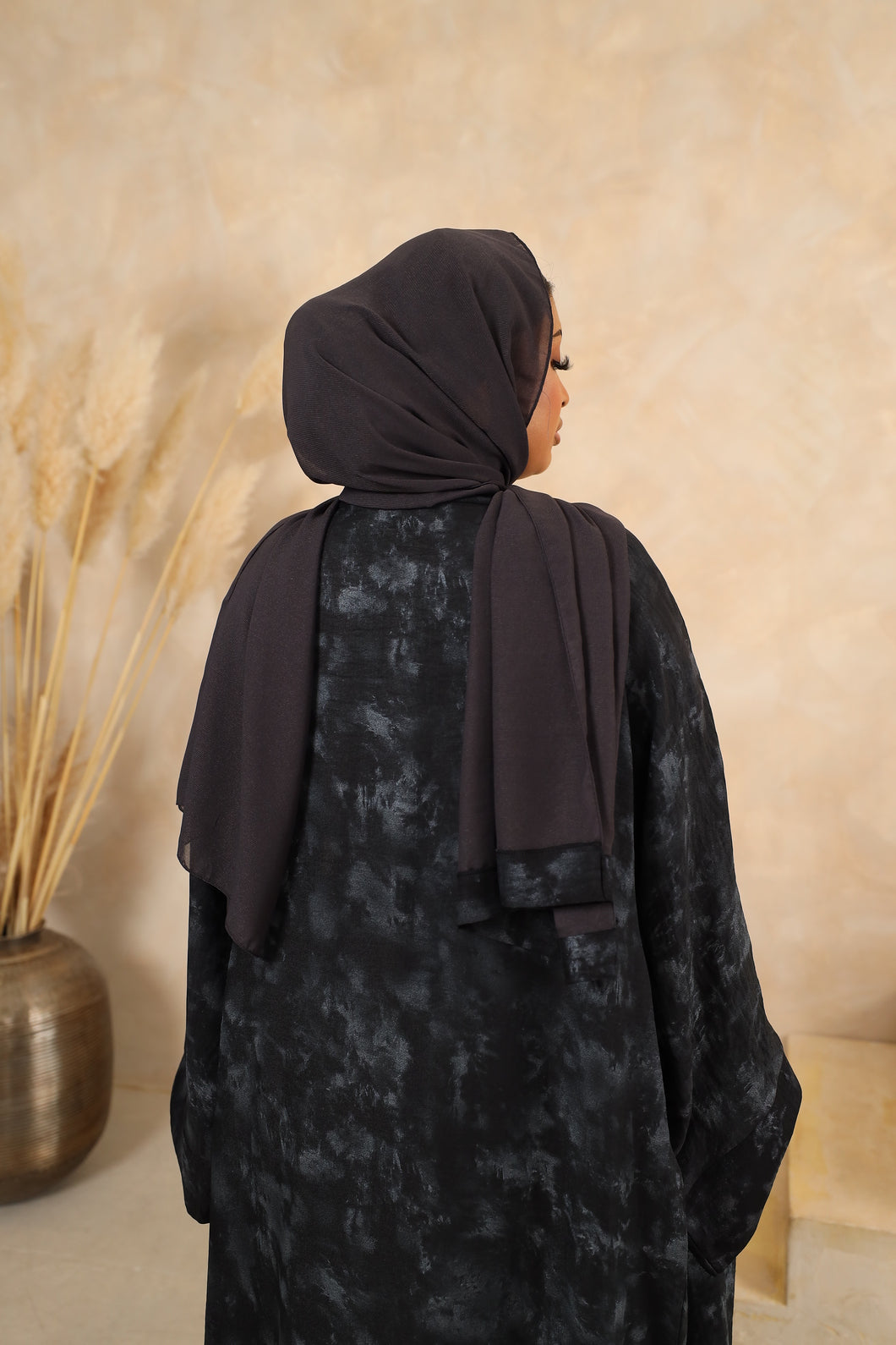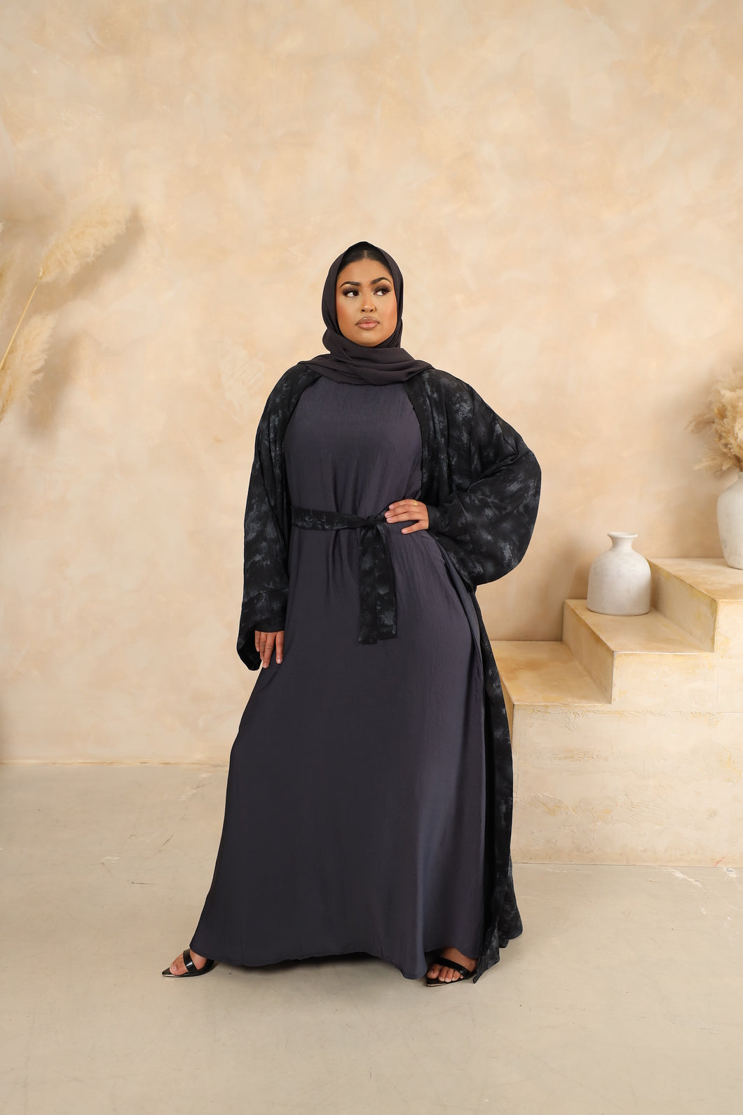 This abaya comprises of a long sleeve inner in a solid silky crush fabric, an open A-line open jacket abaya in a new luxurious soft linen blend Tie dye print and a matching chiffon hijab and belt. This is beautifully finished with pockets on both sides!
