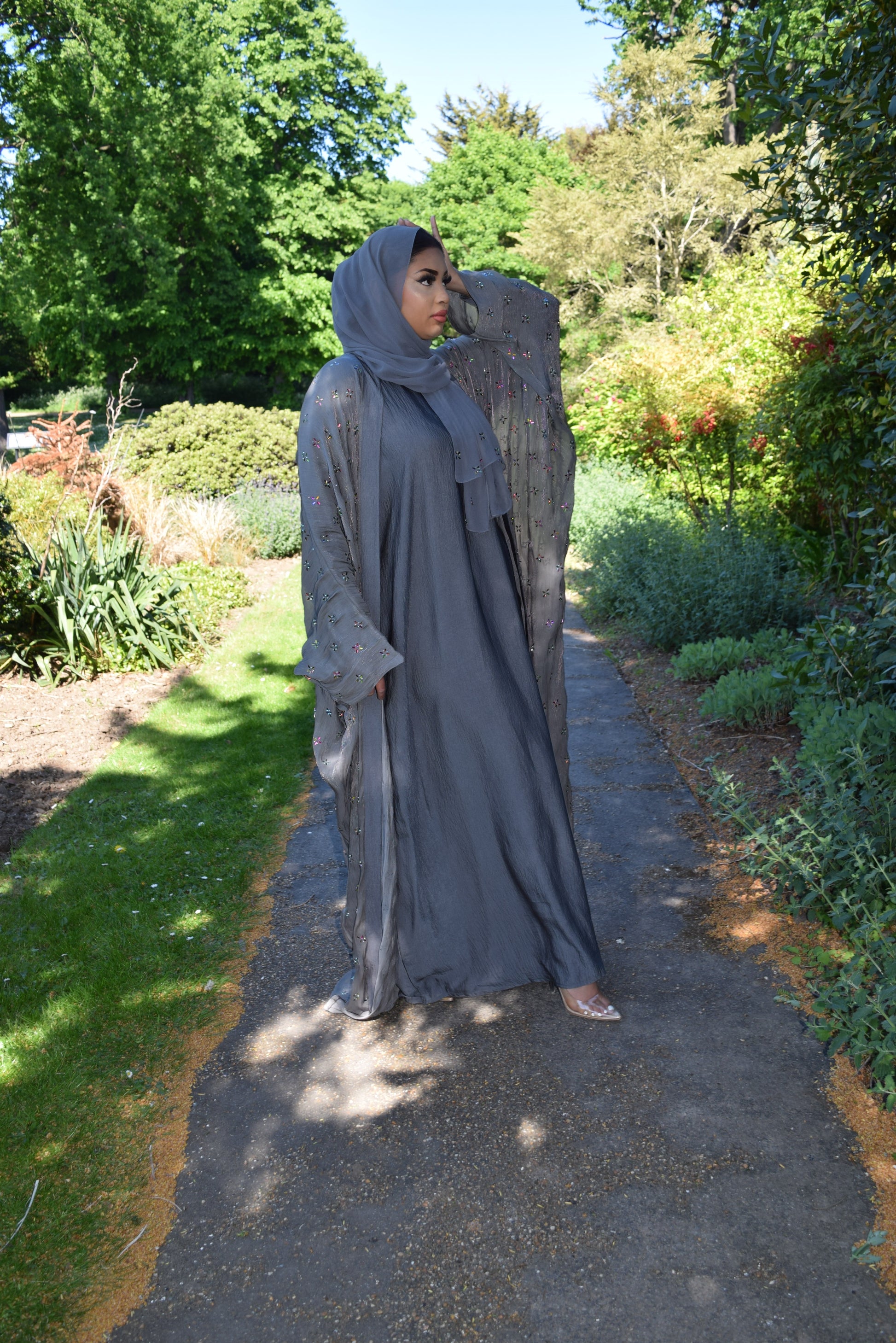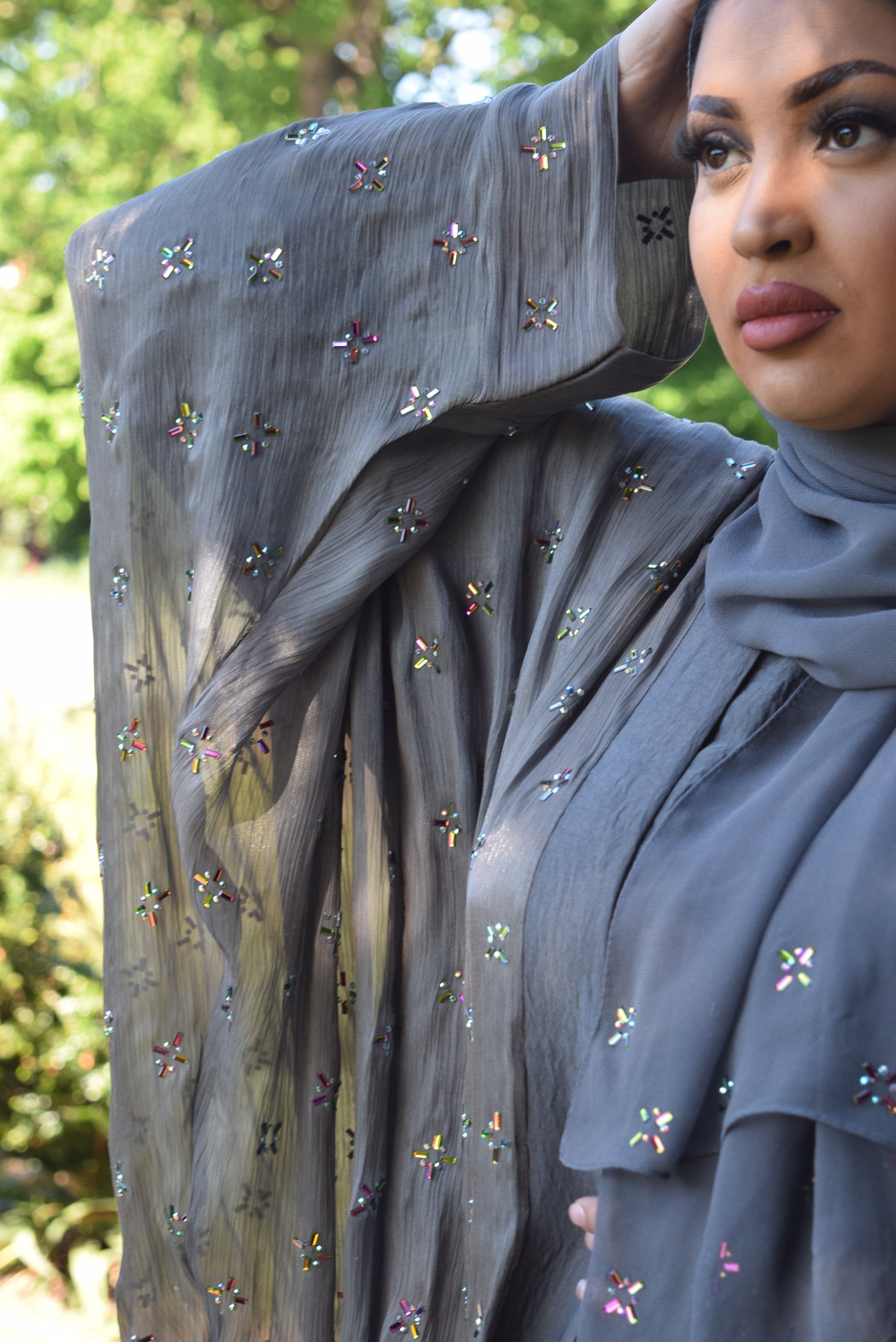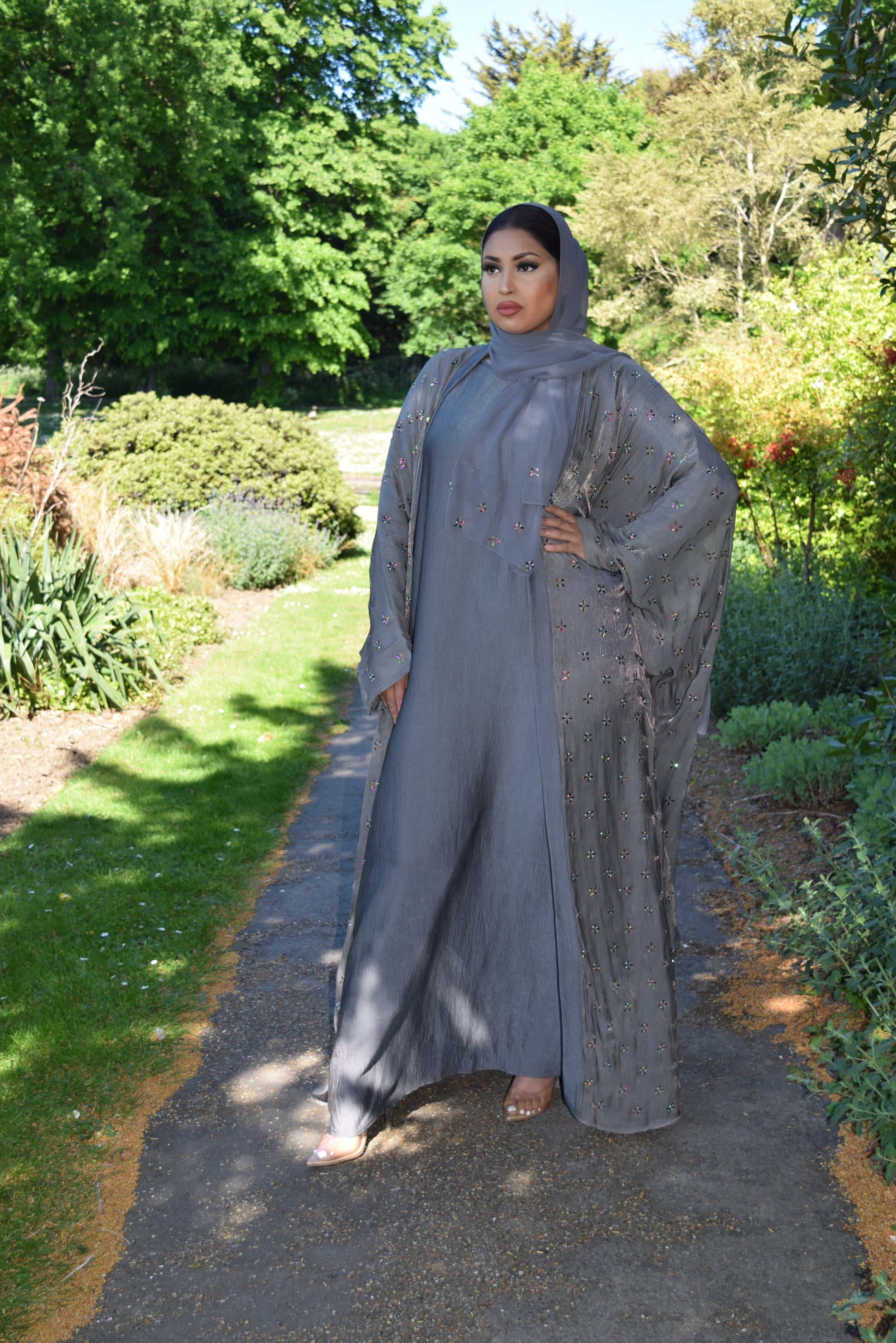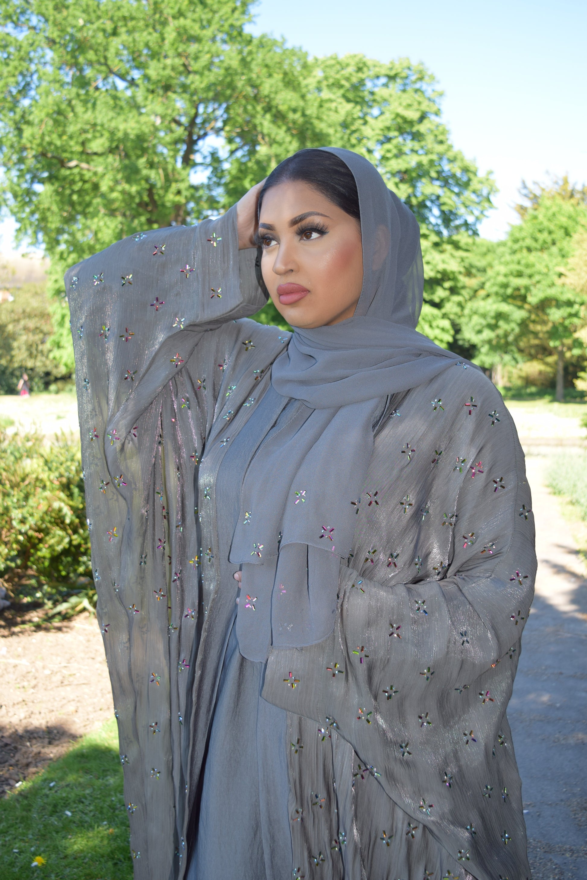 This abaya comes with a matching hijab, also adorned with stones one end. Also available in a Dove Grey