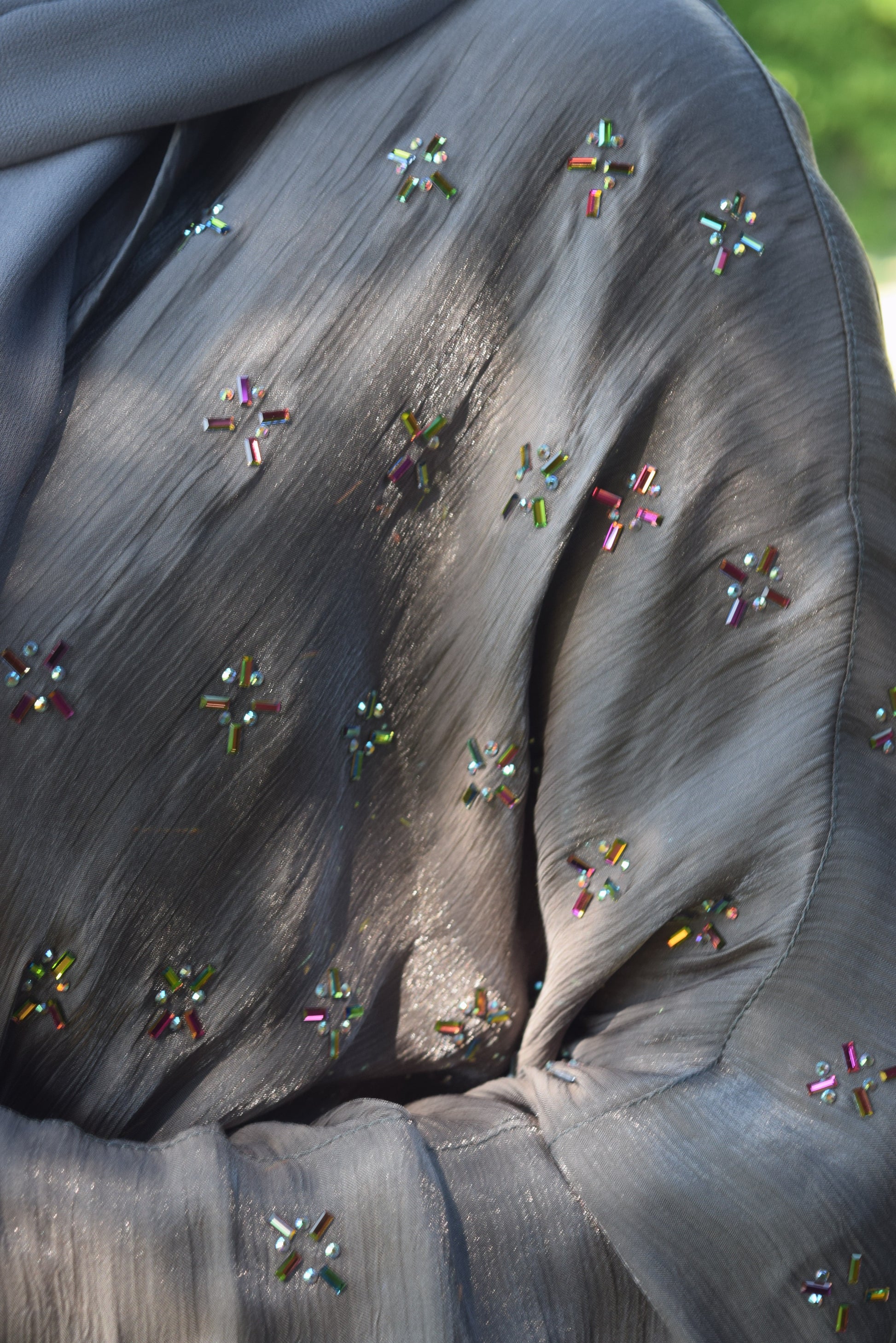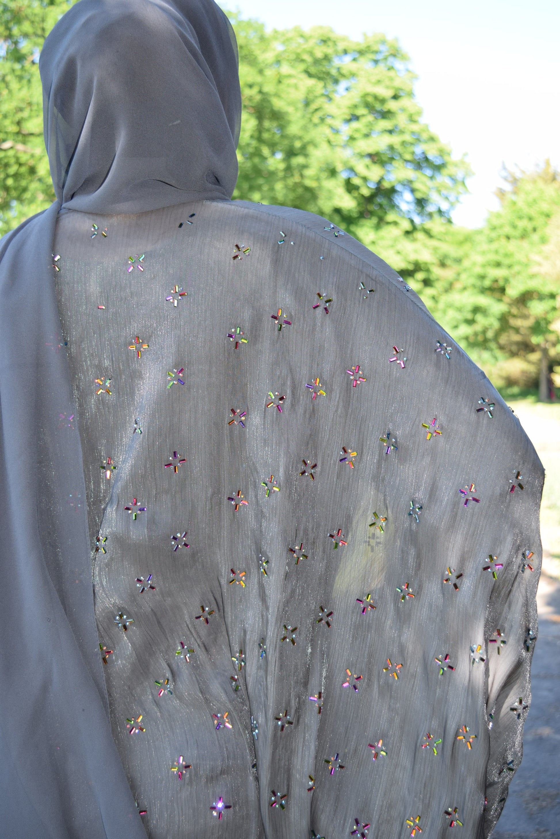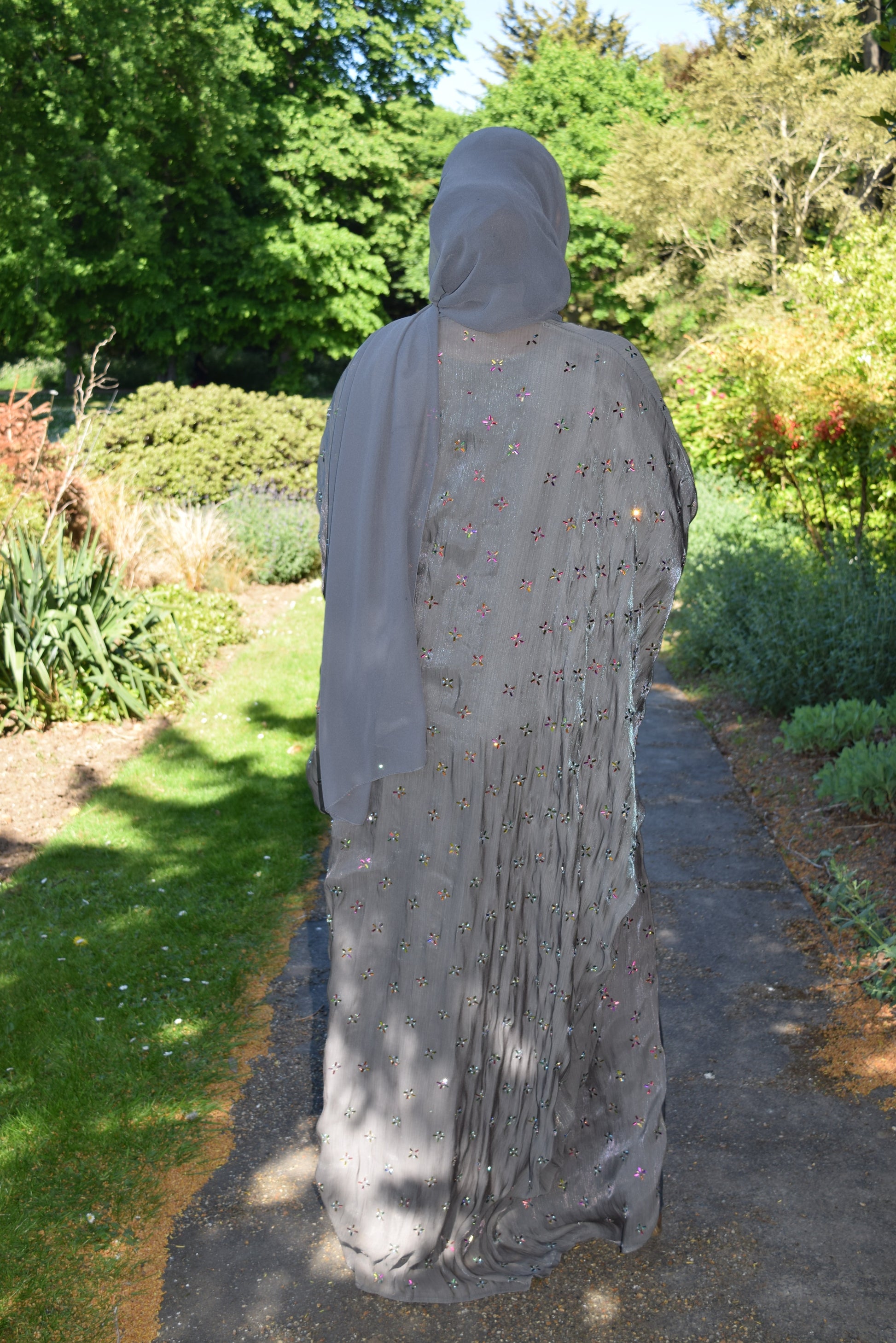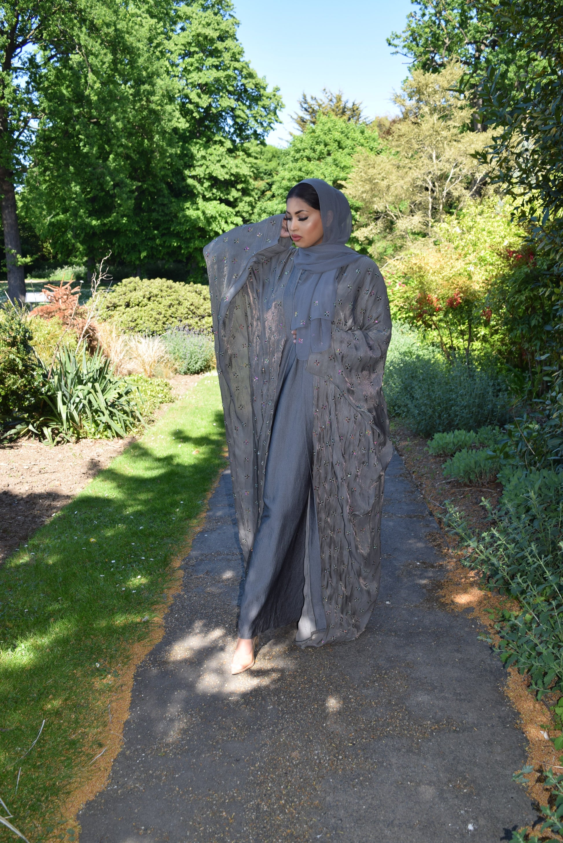 This abaya comes with a matching hijab, also adorned with stones one end. Also available in a Dove Grey