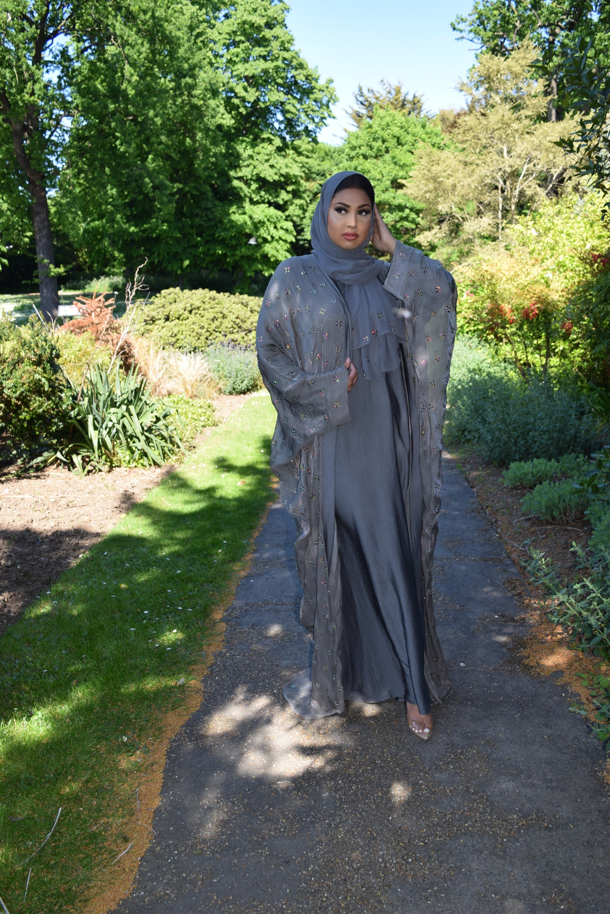 Zayna Stone embellished Organza Farasha Open Jacket with Inner Abaya Khaki Grey