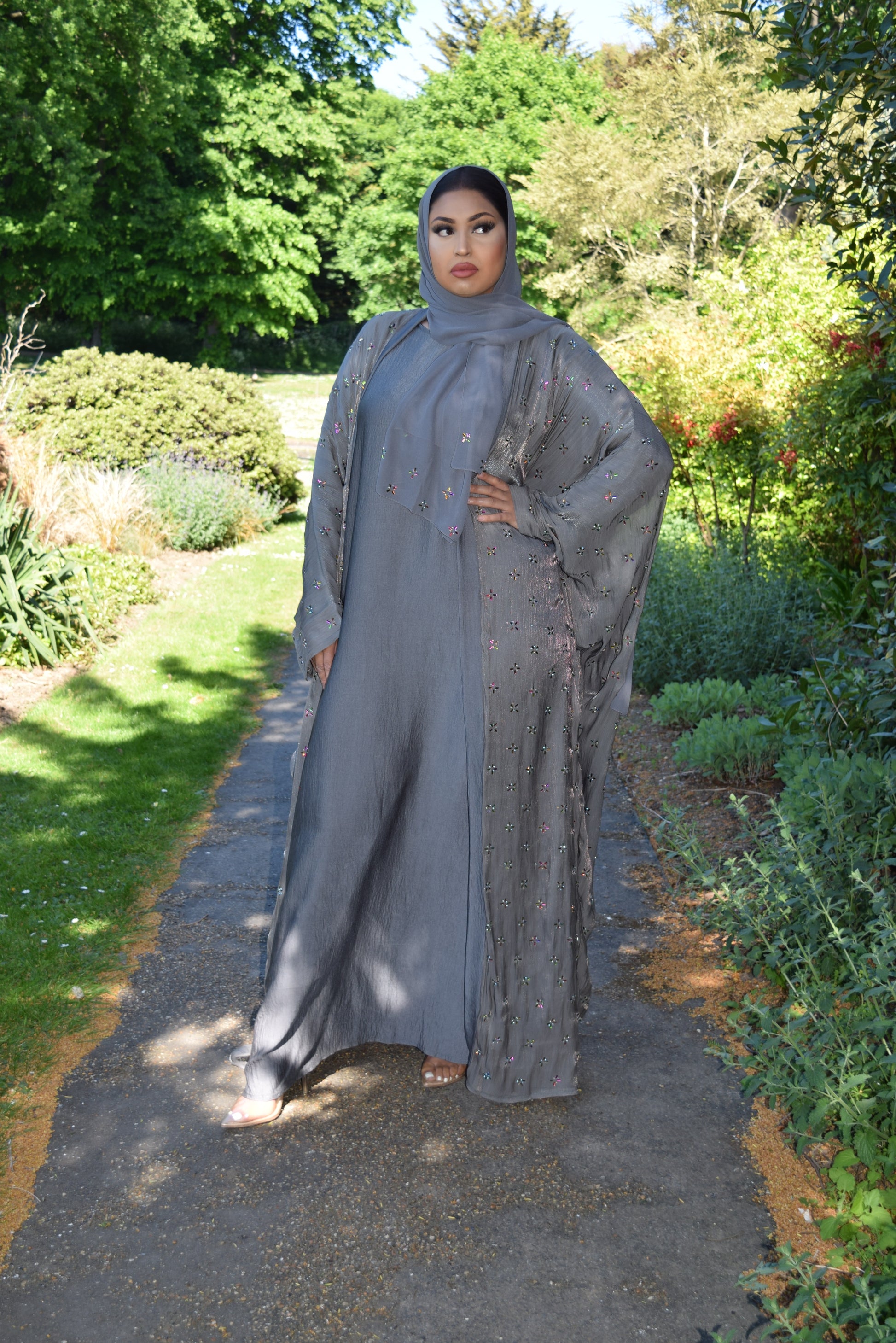 This abaya comprises of a long sleeve inner in a solid silky crush fabric, matched to an open farasha open jacket abaya in a new luxurious crinkle organza silk fabric, adorned with multicoloured stones all over